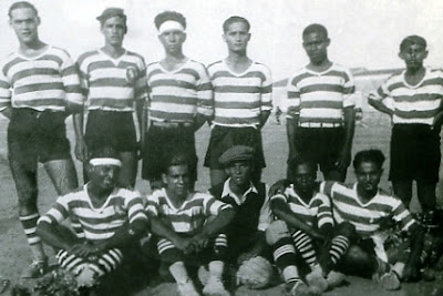 Esta foto tirada no primitivo campo de futebol de Moçâmedes, na década de 1930, é a mais antiga que consegui de atletas do Sporting Clube de Moçâmedes. Convido-vos a colocarem aqui os nomes daqueles que eventualmente reconheçam, pois apenas consigo identificar Armando Guedes da Silva (4º) e Artur Trindade (5º)